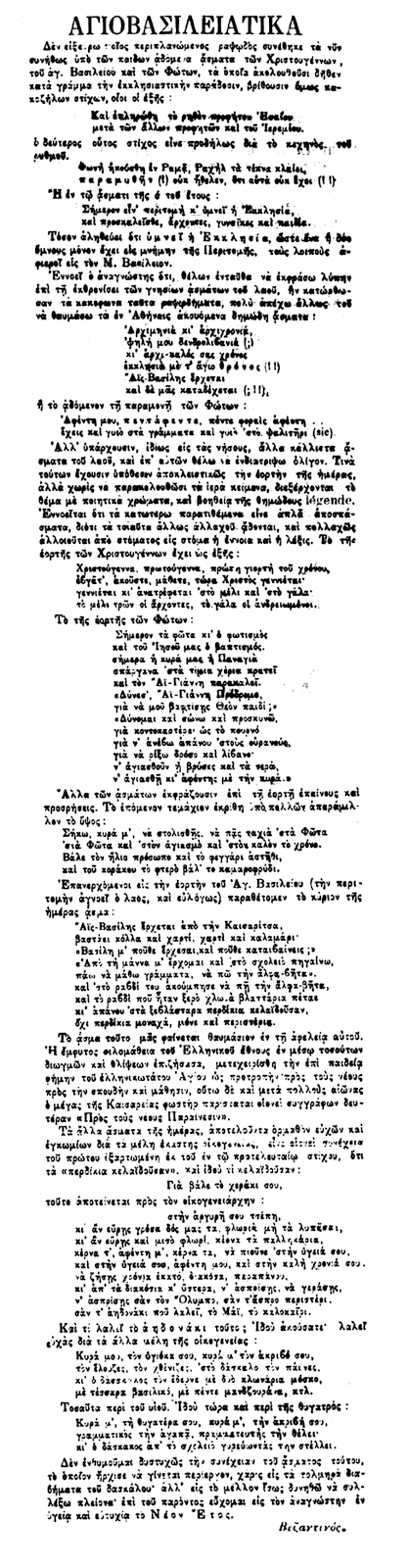 Τόσον αληθεύει ότε υμνεί η Εκκλησία, ώστε ένα ή δύο ύμνους μόνον έχει εις μνήμην τής Περιτομής, τους λοιπούς αφιεροί εις τον Μ. Βασίλειον. Εννοεί ο αναγνώστης ότι, θέλων ενταύθα να εκφράσω λύπην επί τη εκθρονίσει των γνησίων ασσμάτων τού λαού, ην κατώρθωσαν τα κακόφωνα ταύτα ραψωδήματα, πολύ απέχω άλλως του να θαυμάσω τα εν Αθήναις ακουόμενα δημώδη άσματα: